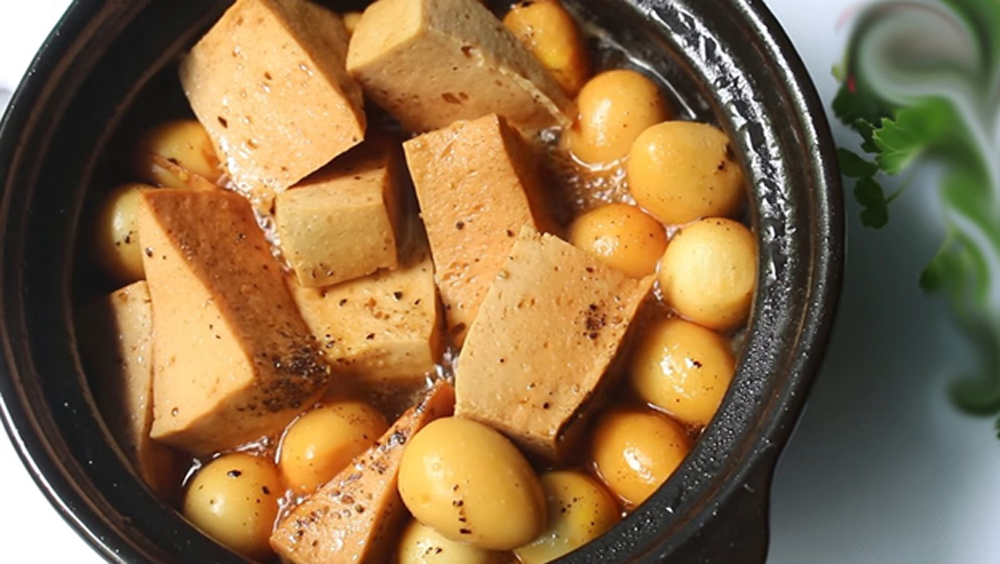 – Cho chả lụa và trứng cút đã ướp vào nồi, để lựa nhỏ và sôi nhẹ đến khi nước keo lại, có màu sánh vàng.