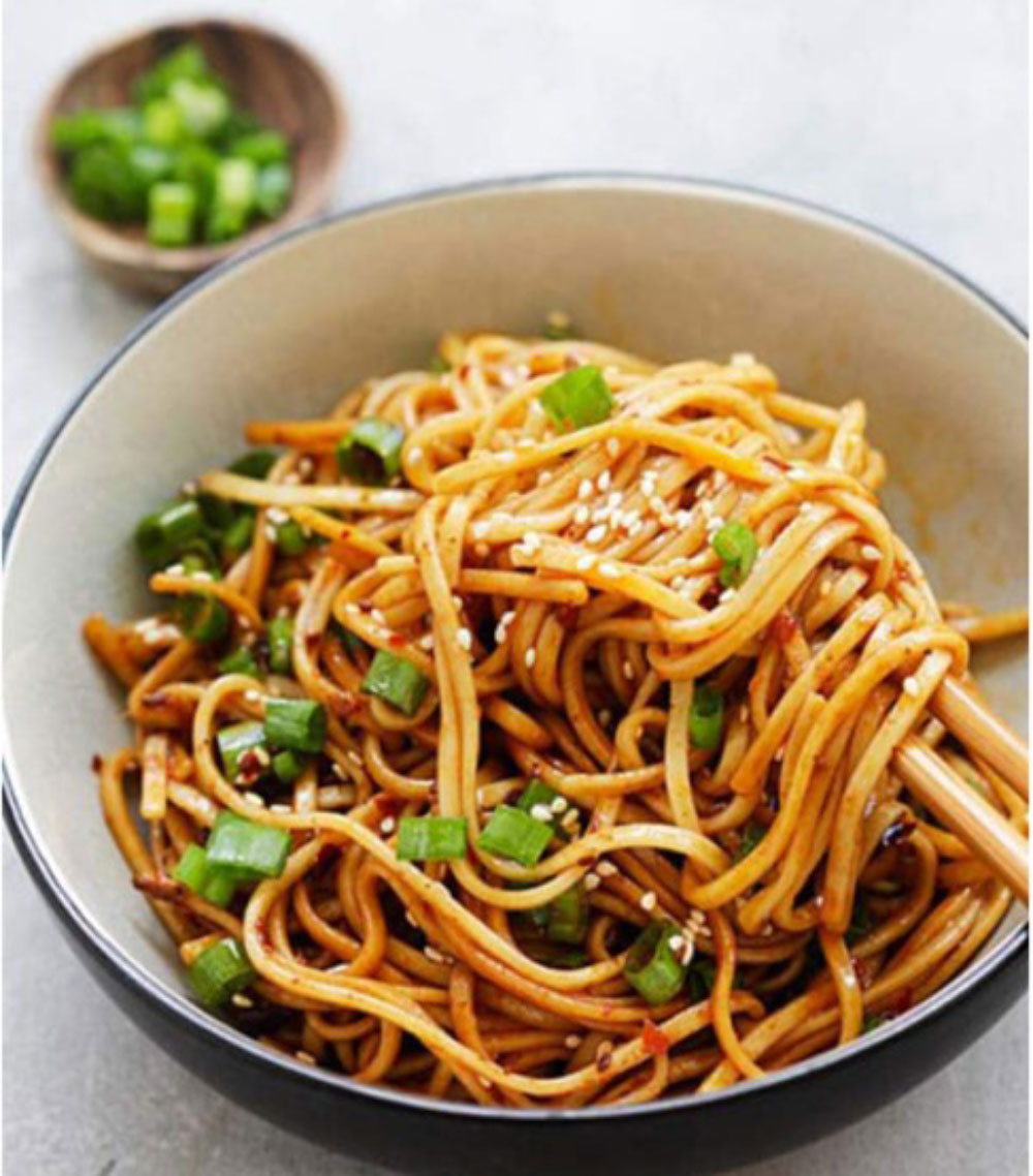 – Cuối cùng trộn mì với nước sốt, rắc lạc rang và hành lá lên trên.