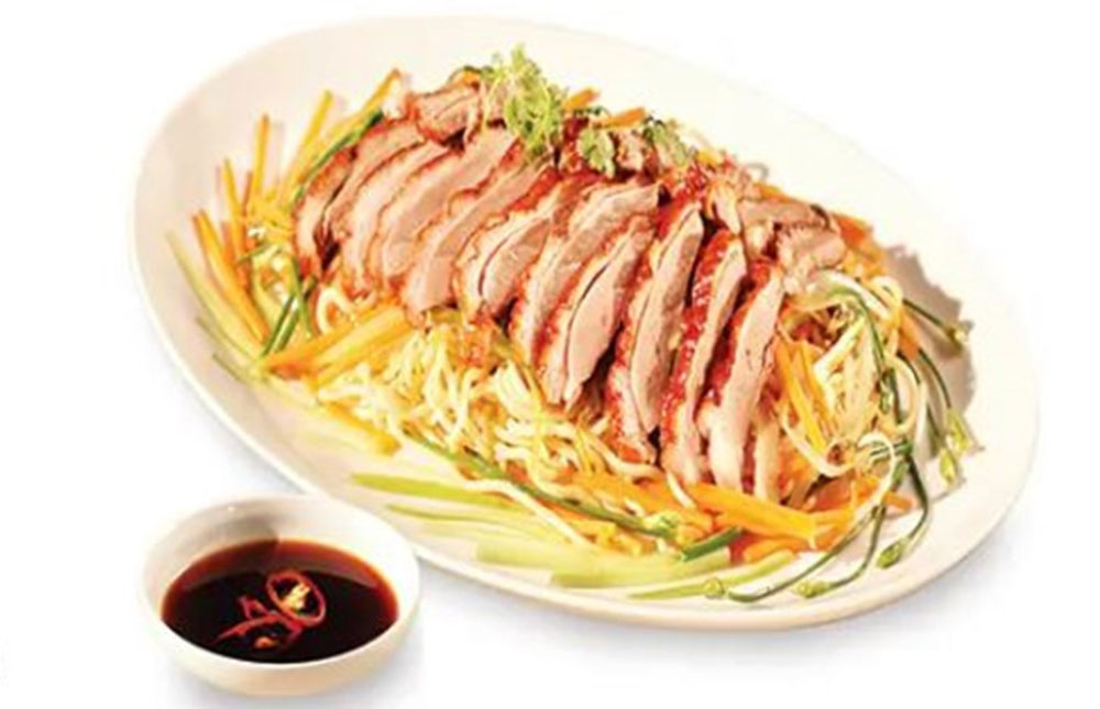 – Xếp mì trứng ra dĩa, xếp rau và thịt vịt quay cắt sợi lên trên. Trang trí với ngò rí, hành lá và ớt cắt sợi.