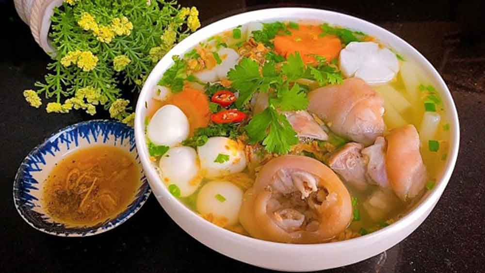 - Cho nui ra từng tô, múc giò heo, củ cải cà rốt, thêm thịt băm lên trên và chan nước dùng. Trang trí thêm hành lá, rau mùi để hoàn thiện món nui giò heo.
