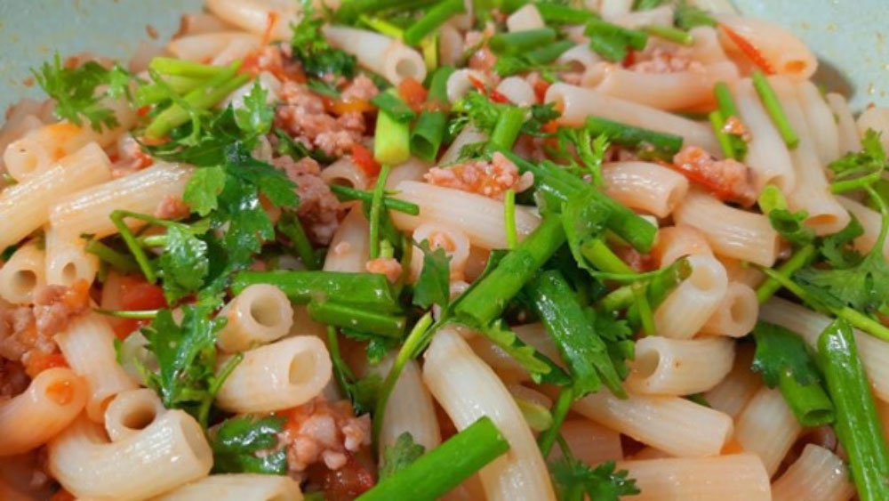 - Tiếp theo, cho thịt xay vào xào đều tay cho đến khi thịt săn lại thì cho nui vào xào cùng. Nêm nếm gia vị vừa ăn, thêm hành lá cắt nhỏ, tiêu xay lên trên cùng rồi tắt bếp.