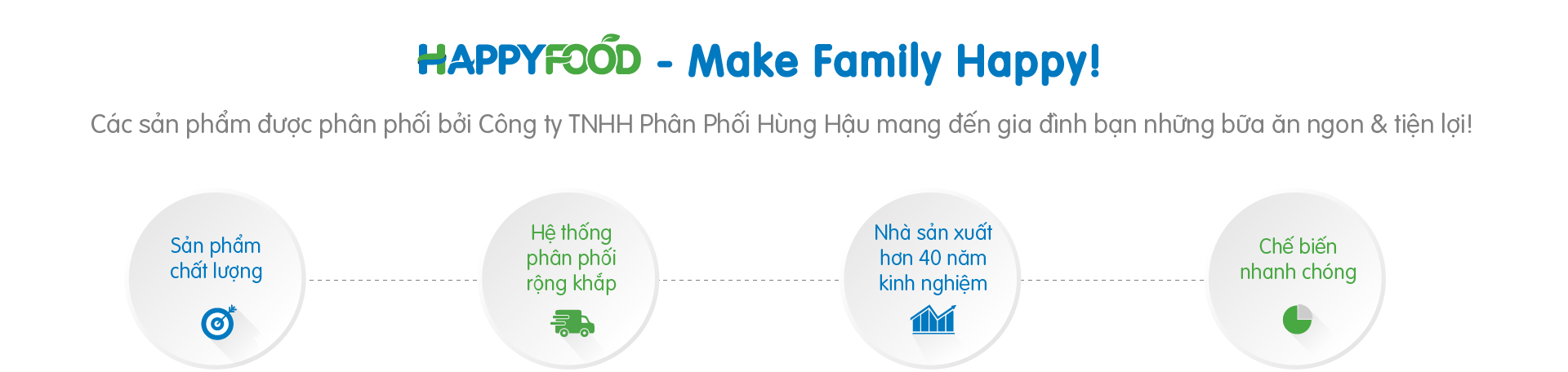 Với lợi thế về chất lượng sản phẩm và chế biến nhanh chóng theo nhu cầu cuộc sống hiện đại, hiện nay, các sản phẩm HappyFood đã có mặt tại gần 400 siêu thị, cửa hàng tiện lợi trên toàn quốc như: BigC, CoopMart, Mega, Aeon Citimart, Satrafood, CoopXtra, Vinmart, BossMart, Auchan, Zakka, 7elevent,… Ngoài ra, chúng tôi cung cấp nguồn hàng giá trị gia tăng uy tín, chất lượng cho các Khách sạn – Nhà hàng cao cấp.