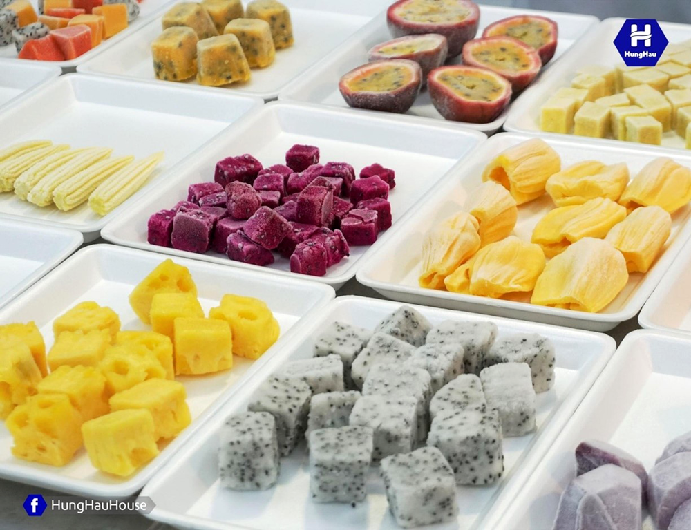 – Chanh dây puree đông lạnh, xoài đông lạnh, khóm đông lạnh, thanh long đỏ đông lạnh, cơm dừa đông lạnh, chuối cắt lát đông lạnh, mít non đông lạnh, sả bào.